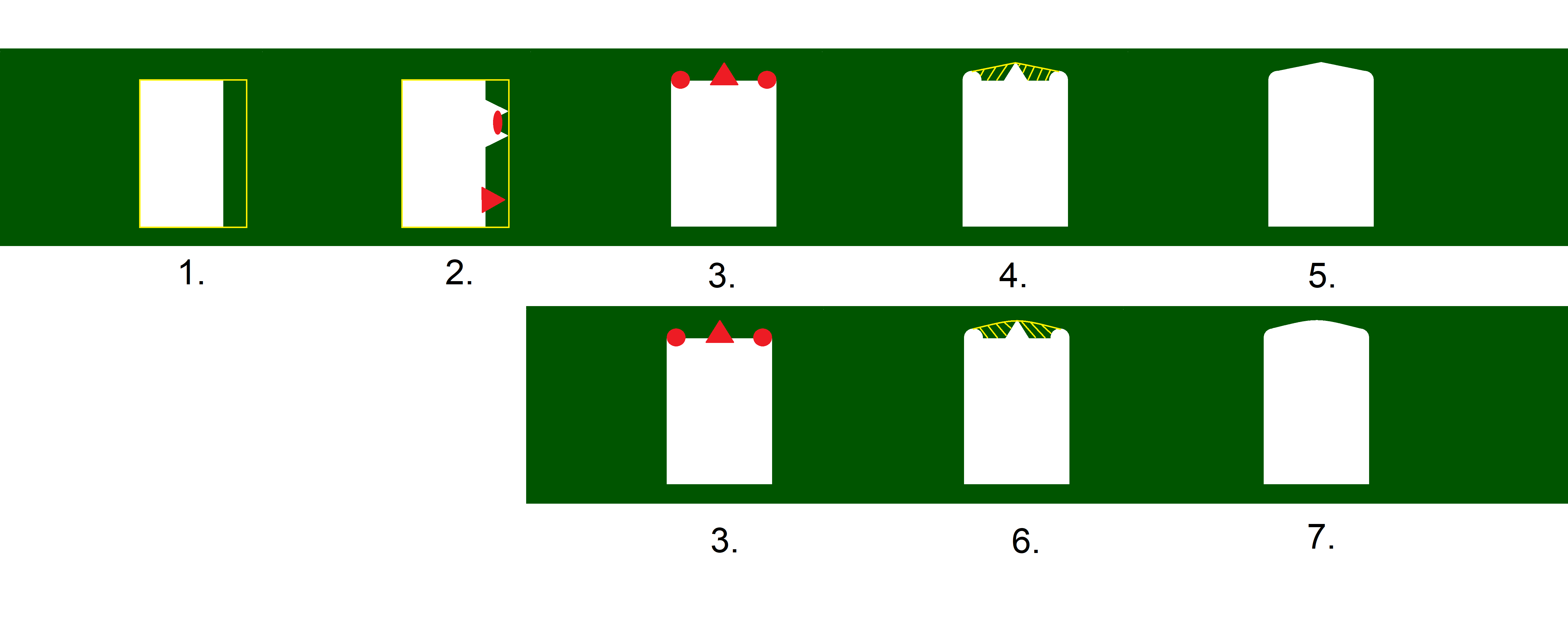 A kocsiszekrény megörökölte donorjai ablakkiosztását, amit módosítani kellett, az ablakokat ki kellett szélesíteni, tetejüket ívesre reszelni. Három módszert próbáltam ki. Az első lényege, hogy az ablak végső ívrére hajlított alumínium csíkot (éljenek az ötvenes dobozok) a két oldalán egy-egy pöttyel megragasztva, hátulról maszkolószalaggal leragasztva létrehozott zsaluba fagitett kentem. Az a módszer... nem működött. Másodikként az oldalfal tetejét cseréltem le, mert az ablakok felett a műanyag "elkopott" az előző procedúra mértéktelen ismételgetése miatt. Ez még annyira sem működött. A legjobb módszer a Termes 53-on kikísérletezett. Kell hozzá egy kerek, lapos, lencse, és háromszög profilú tűreszeló. Először kialakítottam az ablak végső szélességét lapos reszelővel, háromszögletűvel. Ezután háromszög reszelővel az ablak felső éle közepén kicsi vágást ejtettem úgy, hogy kb. 0,7-0,8 mm maradjon a vágás teteje és a tető alja között. Kerek profilú tűreszelővel kialakítottam az ablak lekerekített sarkát, a reszelővel csak felfelé veszek el anyagot. Majd elipszis (lencse) alakú és/vagy lapos tűreszelővel összedolgozom a két sarkot és a csúcsot. Látsd az ábrát!